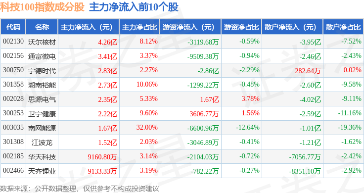 资金流向方面,科技100(399608)指数成份股当日主力资金净流出合计180.47亿元,游资资金净流入合计37.4亿元,散户资金净流入合计143.06亿元。成份股资金流向详情见下表: