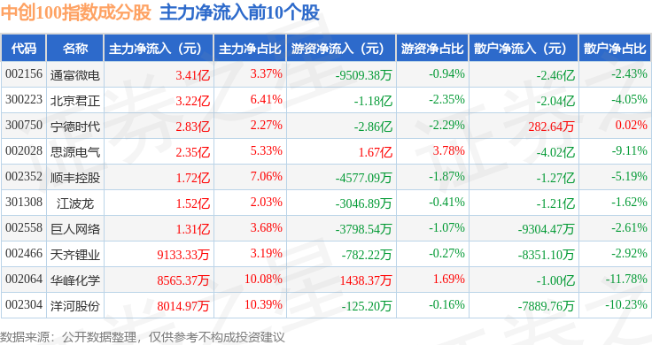 资金流向方面,中创100(399612)指数成份股当日主力资金净流出合计211.42亿元,游资资金净流入合计62.63亿元,散户资金净流入合计148.79亿元。成份股资金流向详情见下表: