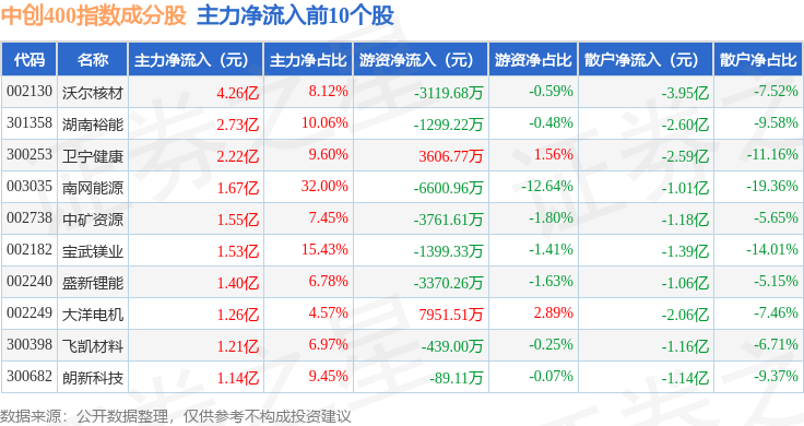 资金流向方面,中创400(399624)指数成份股当日主力资金净流出合计212.97亿元,游资资金净流入合计70.57亿元,散户资金净流入合计142.4亿元。成份股资金流向详情见下表: