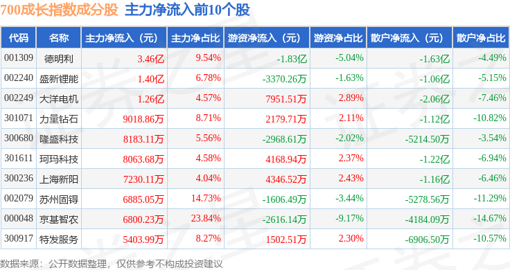 资金流向方面,700成长(399628)指数成份股当日主力资金净流出合计84.1亿元,游资资金净流入合计26.09亿元,散户资金净流入合计58.02亿元。成份股资金流向详情见下表: