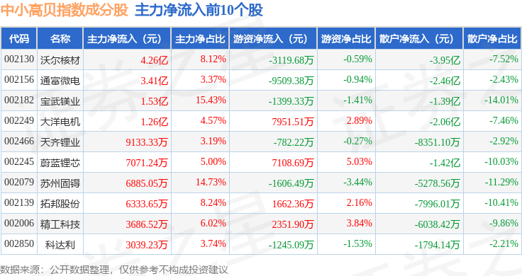 资金流向方面,中小高贝(399664)指数成份股当日主力资金净流出合计117.41亿元,游资资金净流入合计30.7亿元,散户资金净流入合计86.71亿元。成份股资金流向详情见下表:
