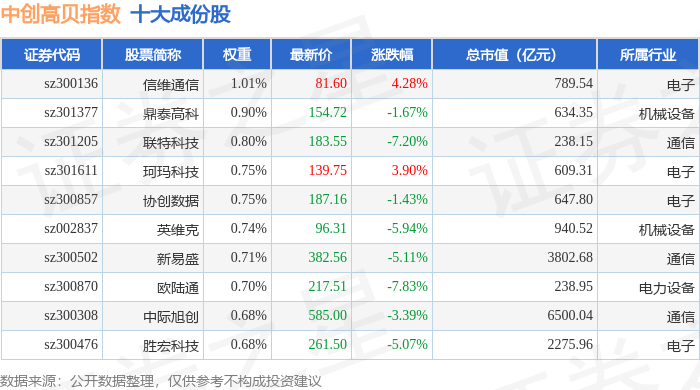 证券之星消息,1月20日,中创高贝(399666)指数报收于2276.91点,跌2.17%,成交4247.46亿元,换手率5.35%。当日该指数成份股中,上涨的有26家,通富微电以5.85%的涨幅领涨,下跌的有172家,易点天下以20.0%的跌幅领跌。