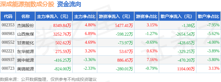 资金流向方面,深成能源(399680)指数成份股当日主力资金净流入合计1.11亿元,游资资金净流入合计5465.34万元,散户资金净流出合计1.66亿元。成份股资金流向详情见下表: