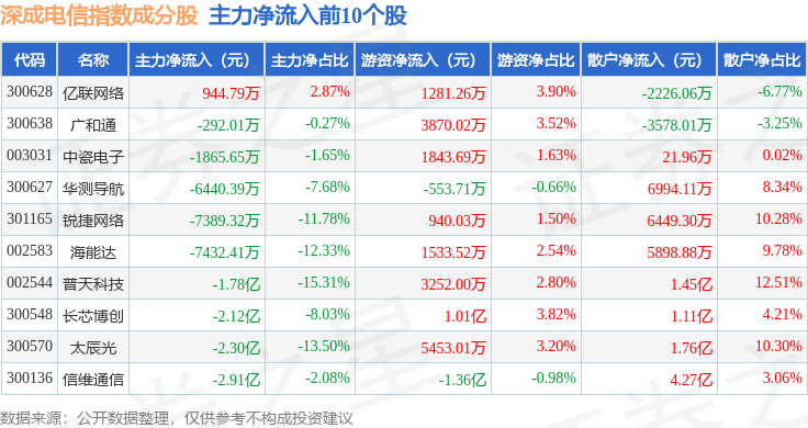 资金流向方面,深成电信(399688)指数成份股当日主力资金净流出合计87.59亿元,游资资金净流入合计34.09亿元,散户资金净流入合计53.5亿元。成份股资金流向详情见下表: