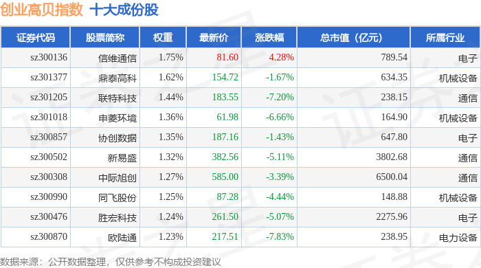 创业高贝(399694)指数十大成份股详情如下: