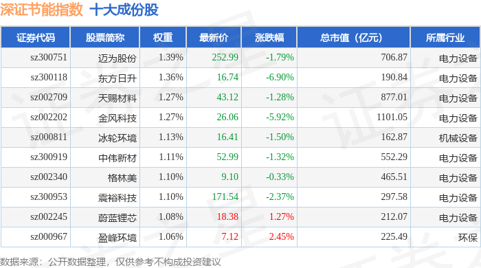 证券之星消息,1月20日,深证节能(399695)指数报收于3091.38点,跌1.47%,成交1604.34亿元,换手率3.02%。当日该指数成份股中,上涨的有33家,南网能源以9.96%的涨幅领涨,下跌的有67家,鹏辉能源以9.32%的跌幅领跌。