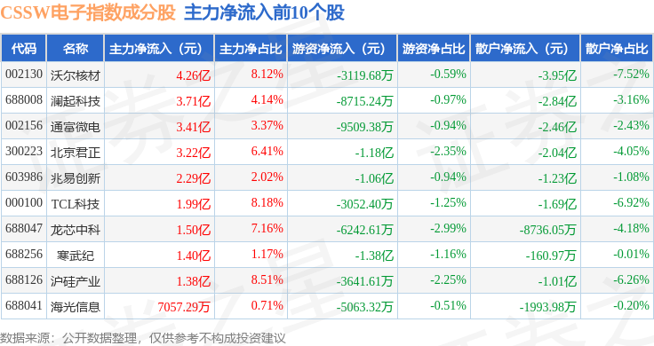 资金流向方面,CSSW电子(399811)指数成份股当日主力资金净流出合计79.5亿元,游资资金净流入合计22.37亿元,散户资金净流入合计57.13亿元。成份股资金流向详情见下表: