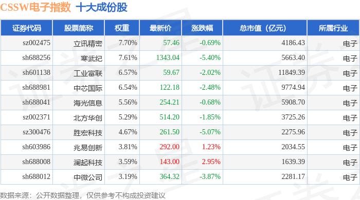 CSSW电子(399811)指数十大成份股详情如下: