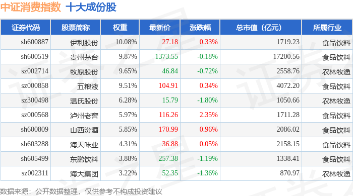 证券之星消息,1月20日,中证消费(399932)指数报收于15098.35点,涨0.34%,成交252.43亿元,换手率1.23%。当日该指数成份股中,上涨的有29家,洋河股份以3.55%的涨幅领涨,下跌的有9家,海南橡胶以2.15%的跌幅领跌。