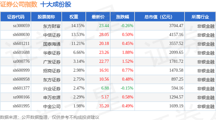 证券之星消息,1月20日,证券公司(399975)指数报收于849.75点,涨0.45%,成交315.81亿元,换手率0.94%。当日该指数成份股中,上涨的有35家,东吴证券以2.31%的涨幅领涨,下跌的有11家,国盛证券以1.45%的跌幅领跌。