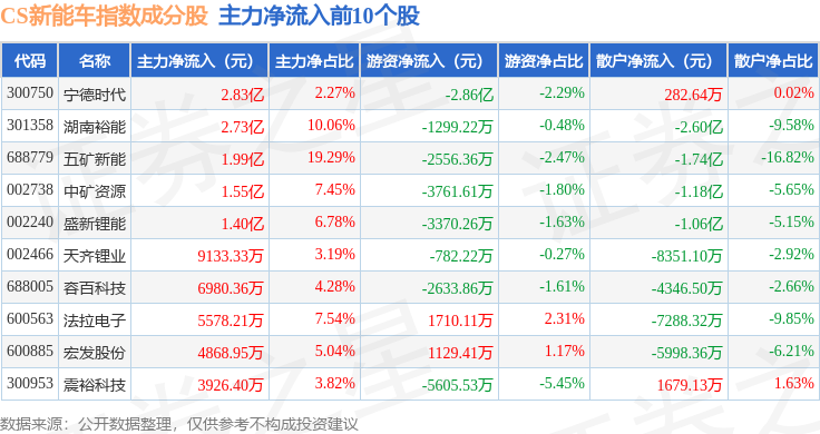 资金流向方面,CS新能车(399976)指数成份股当日主力资金净流出合计59.44亿元,游资资金净流入合计13.53亿元,散户资金净流入合计45.15亿元。成份股资金流向详情见下表: