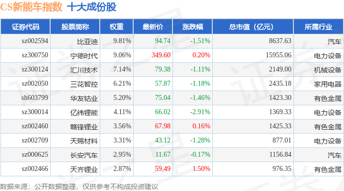 CS新能车(399976)指数十大成份股详情如下: