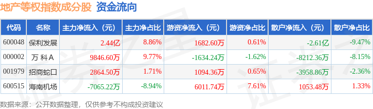 资金流向方面,地产等权(399983)指数成份股当日主力资金净流入合计3.01亿元,游资资金净流入合计7154.47万元,散户资金净流出合计3.72亿元。成份股资金流向详情见下表: