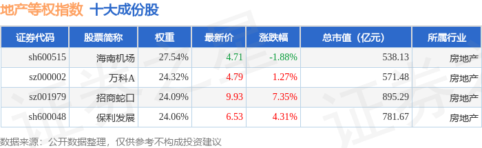 证券之星消息,1月20日,地产等权(399983)指数报收于2094.79点,涨2.81%,成交62.3亿元,换手率2.47%。当日该指数成份股中,上涨的有3家,招商蛇口以7.35%的涨幅领涨,下跌的有1家,海南机场以1.88%的跌幅领跌。