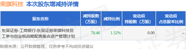 证券之星消息,1月20日荣旗科技发布公告《荣旗科技:关于员工战略配售资管计划减持股份计划实施完毕的公告》,其股东东吴证券-工商银行-东吴证券荣旗科技员工参与创业板战略配售集合资产管理计划于2026年1月8日至2026年1月19日间合计减持70.46万股,占公司目前总股本的1.321%,变动期间该股股价上涨8.49%,截止1月19日收盘报83.41元。