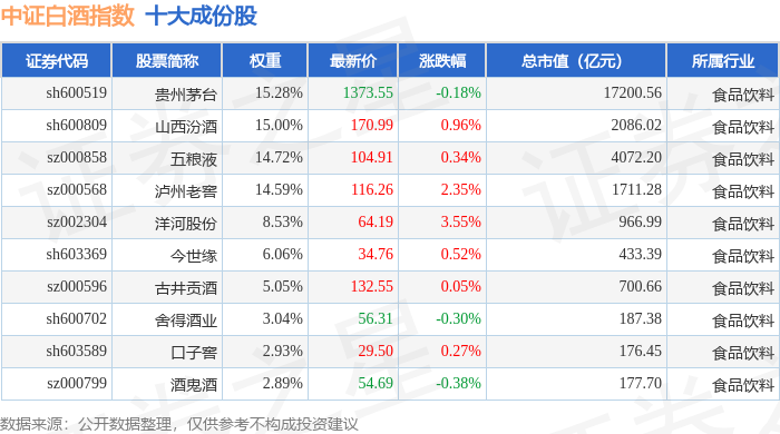 证券之星消息,1月20日,中证白酒(399997)指数报收于8793.5点,涨0.9%,成交132.68亿元,换手率0.79%。当日该指数成份股中,上涨的有14家,洋河股份以3.55%的涨幅领涨,下跌的有4家,酒鬼酒以0.38%的跌幅领跌。