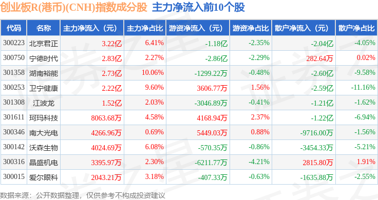 资金流向方面,创业板R(港币)(CNH)(470006)指数成份股当日主力资金净流出合计178.21亿元,游资资金净流入合计61.27亿元,散户资金净流入合计116.95亿元。成份股资金流向详情见下表: