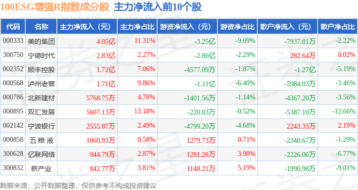 资金流向方面,100ESG增强R(470033)指数成份股当日主力资金净流出合计107.63亿元,游资资金净流入合计35.35亿元,散户资金净流入合计72.28亿元。成份股资金流向详情见下表: