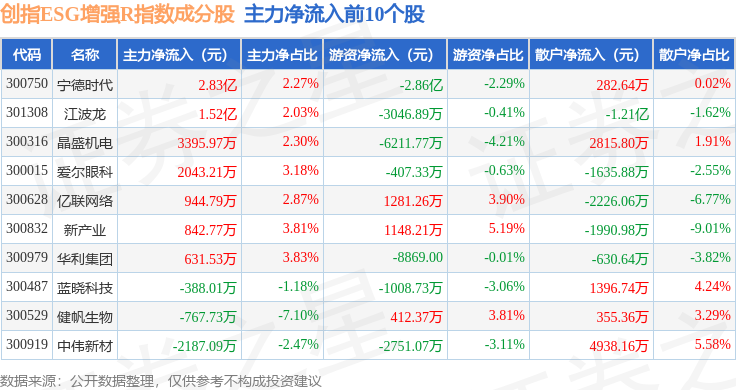 资金流向方面,创指ESG增强R(470034)指数成份股当日主力资金净流出合计130.76亿元,游资资金净流入合计40.79亿元,散户资金净流入合计89.96亿元。成份股资金流向详情见下表: