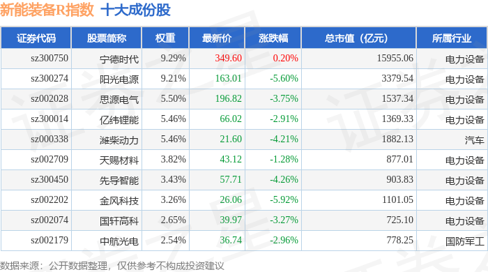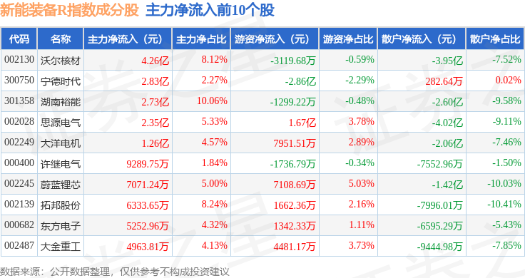 资金流向方面,新能装备R(470043)指数成份股当日主力资金净流出合计72.58亿元,游资资金净流入合计18.01亿元,散户资金净流入合计54.58亿元。成份股资金流向详情见下表: