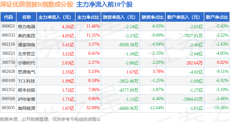 资金流向方面,深证优质信披R(470065)指数成份股当日主力资金净流出合计319.37亿元,游资资金净流入合计84.32亿元,散户资金净流入合计235.05亿元。成份股资金流向详情见下表: