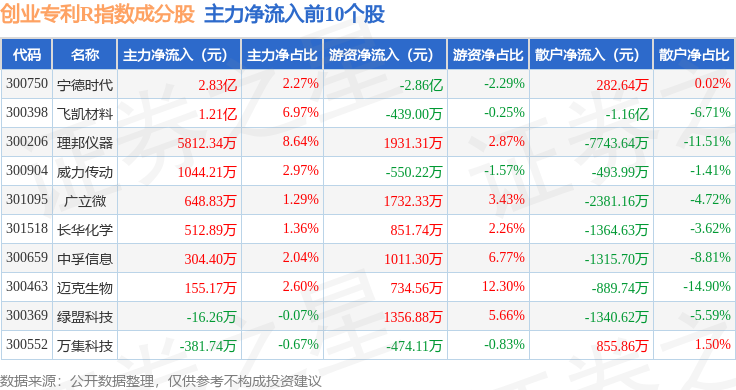 资金流向方面,创业专利R(470068)指数成份股当日主力资金净流出合计66.0亿元,游资资金净流入合计12.6亿元,散户资金净流入合计53.4亿元。成份股资金流向详情见下表: