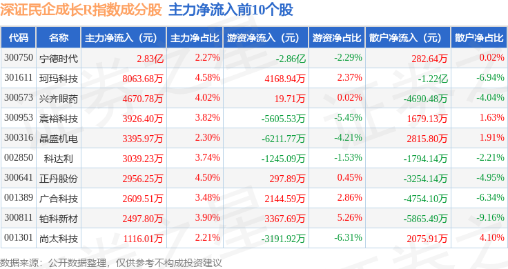资金流向方面,深证民企成长R(470071)指数成份股当日主力资金净流出合计127.37亿元,游资资金净流入合计46.98亿元,散户资金净流入合计80.39亿元。成份股资金流向详情见下表: