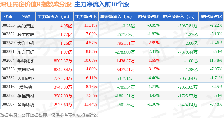 资金流向方面,深证民企价值R(470072)指数成份股当日主力资金净流出合计22.09亿元,游资资金净流入合计4.83亿元,散户资金净流入合计17.26亿元。成份股资金流向详情见下表: