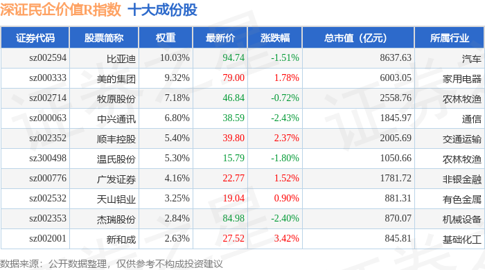 深证民企价值R(470072)指数十大成份股详情如下: