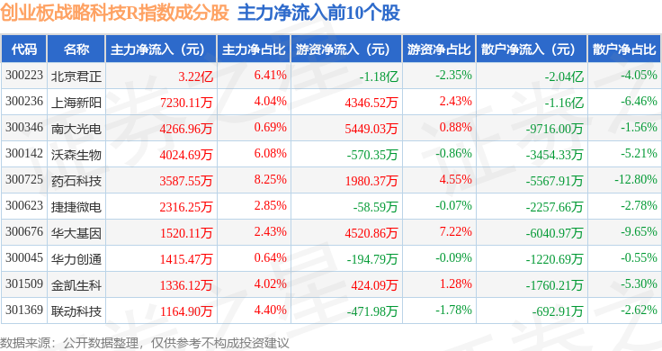 资金流向方面,创业板战略科技R(471004)指数成份股当日主力资金净流出合计22.73亿元,游资资金净流入合计7.66亿元,散户资金净流入合计15.06亿元。成份股资金流向详情见下表: