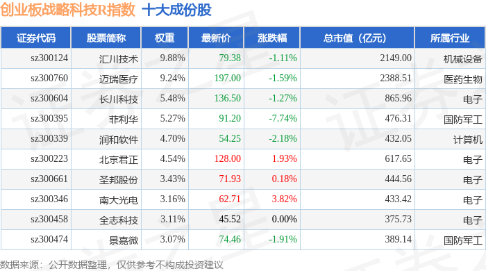 创业板战略科技R(471004)指数十大成份股详情如下: