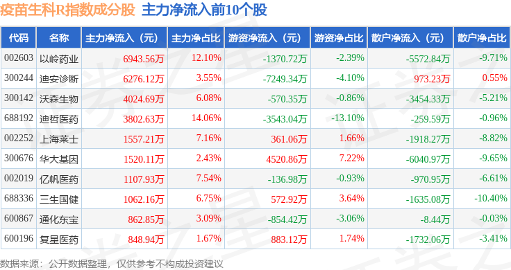 资金流向方面,疫苗生科R(480015)指数成份股当日主力资金净流出合计12.46亿元,游资资金净流入合计2771.68万元,散户资金净流入合计12.18亿元。成份股资金流向详情见下表: