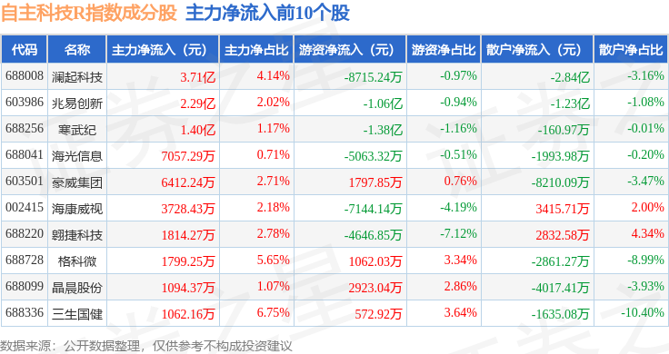 资金流向方面,自主科技R(480033)指数成份股当日主力资金净流出合计58.22亿元,游资资金净流入合计17.45亿元,散户资金净流入合计40.77亿元。成份股资金流向详情见下表:
