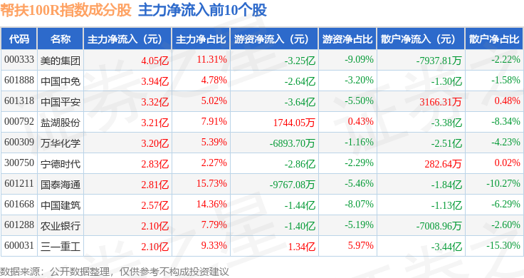 资金流向方面,帮扶100R(480065)指数成份股当日主力资金净流出合计95.03亿元,游资资金净流出合计8.07亿元,散户资金净流入合计103.1亿元。成份股资金流向详情见下表: