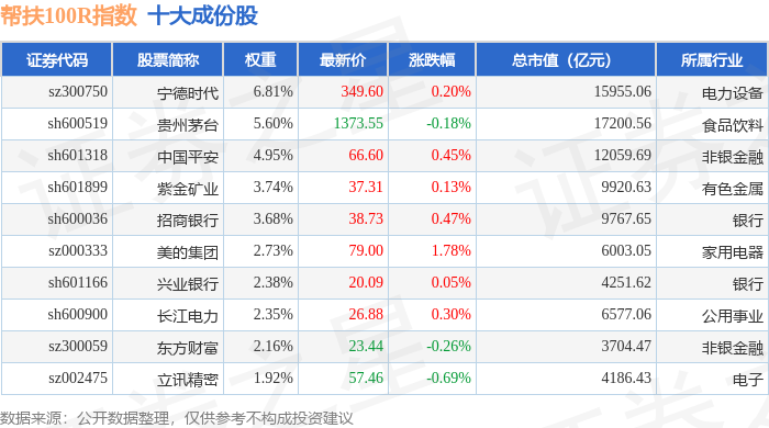 帮扶100R(480065)指数十大成份股详情如下: