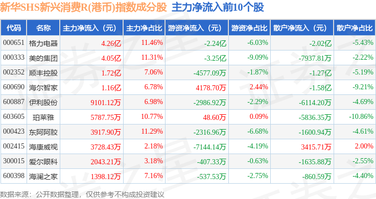 资金流向方面,新华SHS新兴消费R(港币)(489007)指数成份股当日主力资金净流出合计11.0亿元,游资资金净流入合计4880.68万元,散户资金净流入合计10.51亿元。成份股资金流向详情见下表: