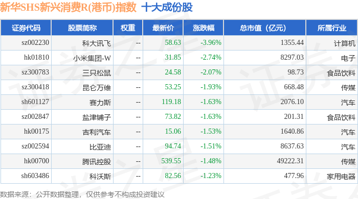 新华SHS新兴消费R(港币)(489007)指数十大成份股详情如下: