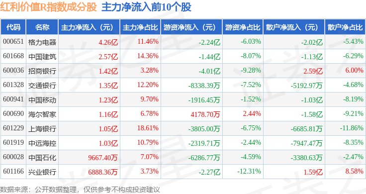 资金流向方面,红利价值R(489016)指数成份股当日主力资金净流入合计15.93亿元,游资资金净流出合计12.13亿元,散户资金净流出合计3.8亿元。成份股资金流向详情见下表: