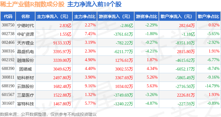 资金流向方面,稀土产业链R(489013)指数成份股当日主力资金净流出合计72.02亿元,游资资金净流入合计20.12亿元,散户资金净流入合计51.9亿元。成份股资金流向详情见下表: