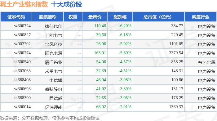 证券之星消息,1月20日,稀土产业链R(489013)指数报收于4249.19点,跌1.95%,成交1027.08亿元,换手率3.34%。当日该指数成份股中,上涨的有13家,国电南自以3.05%的涨幅领涨,下跌的有37家,捷佳伟创以6.2%的跌幅领跌。