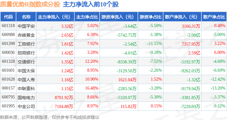 资金流向方面,质量优势R(489017)指数成份股当日主力资金净流出合计13.64亿元,游资资金净流入合计4.68亿元,散户资金净流入合计8.96亿元。成份股资金流向详情见下表: