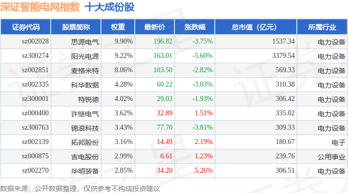 资金流向方面,深证智能电网(970054)指数成份股当日主力资金净流出合计27.19亿元,游资资金净流入合计12.63亿元,散户资金净流入合计14.57亿元。成份股资金流向详情见下表:
