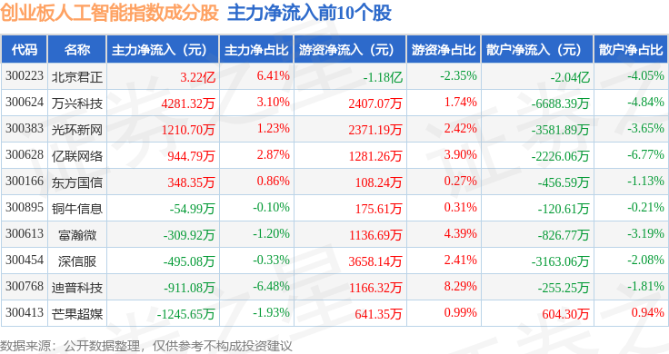 资金流向方面,创业板人工智能(970070)指数成份股当日主力资金净流出合计87.98亿元,游资资金净流入合计40.8亿元,散户资金净流入合计47.17亿元。成份股资金流向详情见下表: