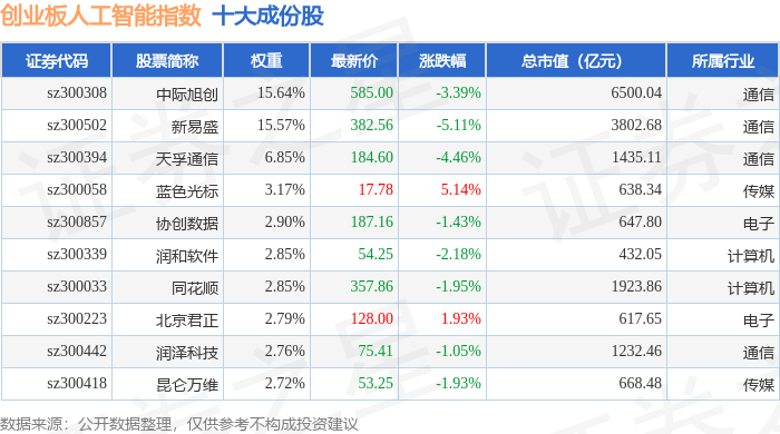 证券之星消息,1月20日,创业板人工智能(970070)指数报收于6258.54点,跌2.77%,成交1113.24亿元,换手率6.27%。当日该指数成份股中,上涨的有4家,蓝色光标以5.14%的涨幅领涨,下跌的有45家,易点天下以20.0%的跌幅领跌。