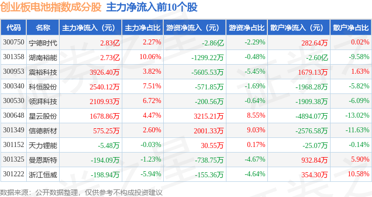 资金流向方面,创业板电池(970081)指数成份股当日主力资金净流出合计45.99亿元,游资资金净流入合计9.79亿元,散户资金净流入合计36.19亿元。成份股资金流向详情见下表: