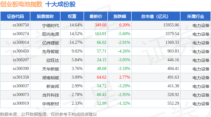 创业板电池(970081)指数十大成份股详情如下:
