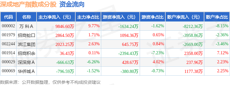 资金流向方面,深成地产(971001)指数成份股当日主力资金净流入合计1.33亿元,游资资金净流出合计2240.67万元,散户资金净流出合计1.11亿元。成份股资金流向详情见下表: