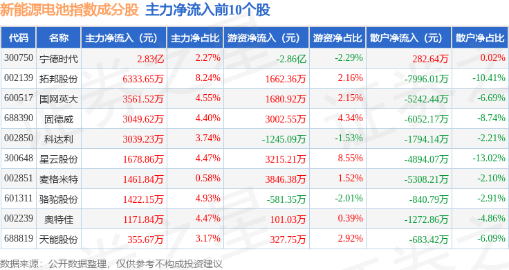 资金流向方面,新能源电池(980027)指数成份股当日主力资金净流出合计53.9亿元,游资资金净流入合计17.02亿元,散户资金净流入合计36.89亿元。成份股资金流向详情见下表: