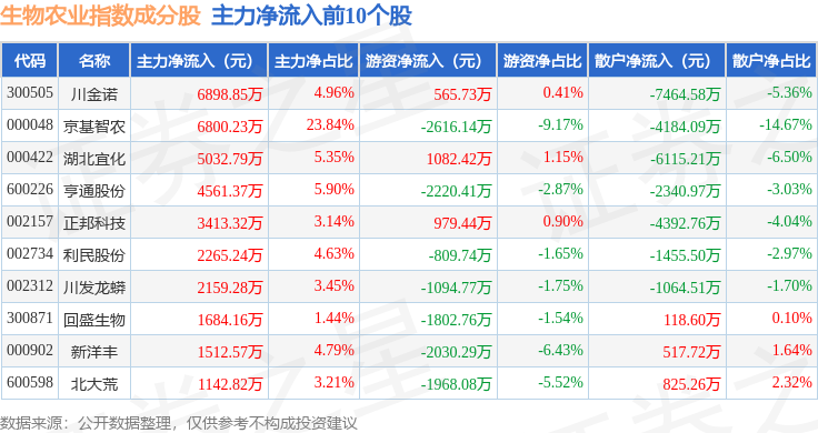 资金流向方面,生物农业(980072)指数成份股当日主力资金净流出合计9.8亿元,游资资金净流入合计1604.45万元,散户资金净流入合计9.74亿元。成份股资金流向详情见下表: