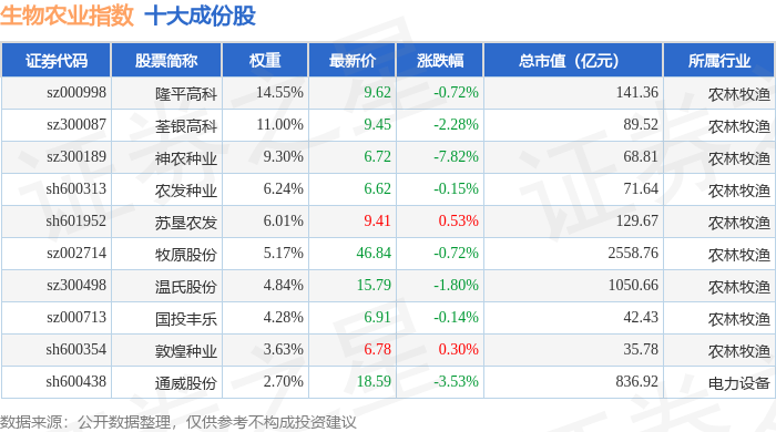 生物农业(980072)指数十大成份股详情如下: